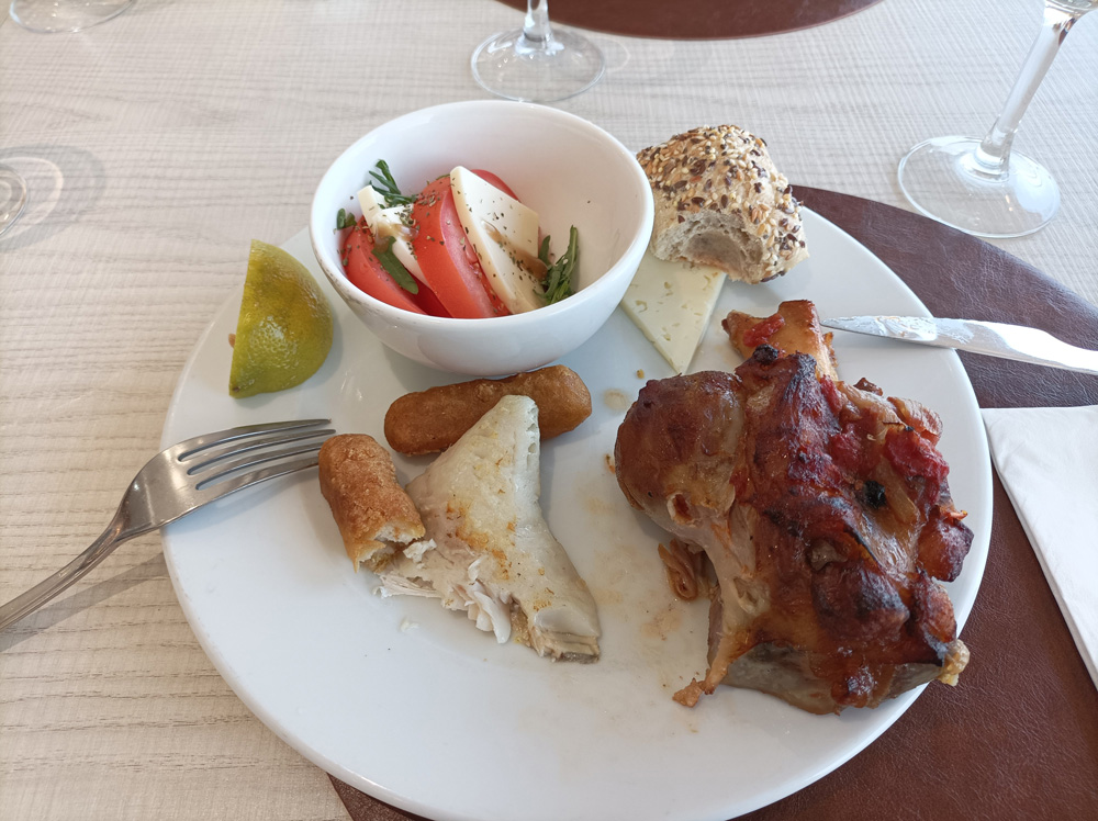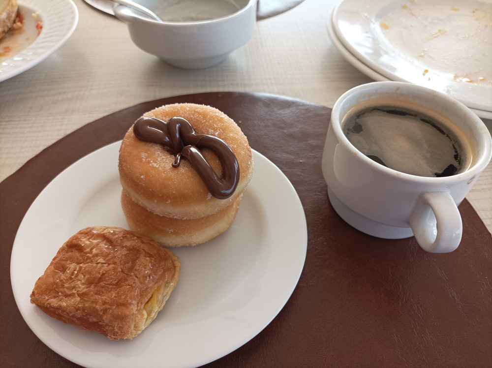 I had a hot croissant with salami and Swiss cheese, a fried egg, two slices of bacon, three pieces of fried chicken breast, zucchini and tomatoes, a piece of mackerel, pate on toast, jam on toast, a chocolate croissant with chocolate sauce, another pastry, watermelon, pineapple, cantaloupe, watermelon slushie, mint water and grapefruit water. And coffee. I may have missed a few items, but that's what I remember.