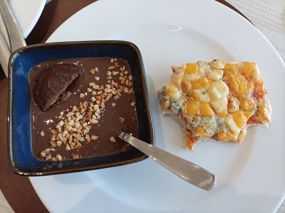 We were cutting it close. Lunch buffet ends at 3 and it was 2:30. Lunch is 20 € pp with inclusion of beverage. So we downed a bottle of red and heaping portions of fish, meat, French potatoes, pasta and vegetables (what—we were hungry), plus dessert.
